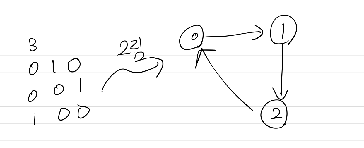 가중치 없는 방향 그래프 G가 주어졌을 때, 모든 정점 (i, j)에 대해서, i에서 j로 가는 길이가 양수인 경로가 있는지 없는지 구하는 프로그램을 작성하시오.