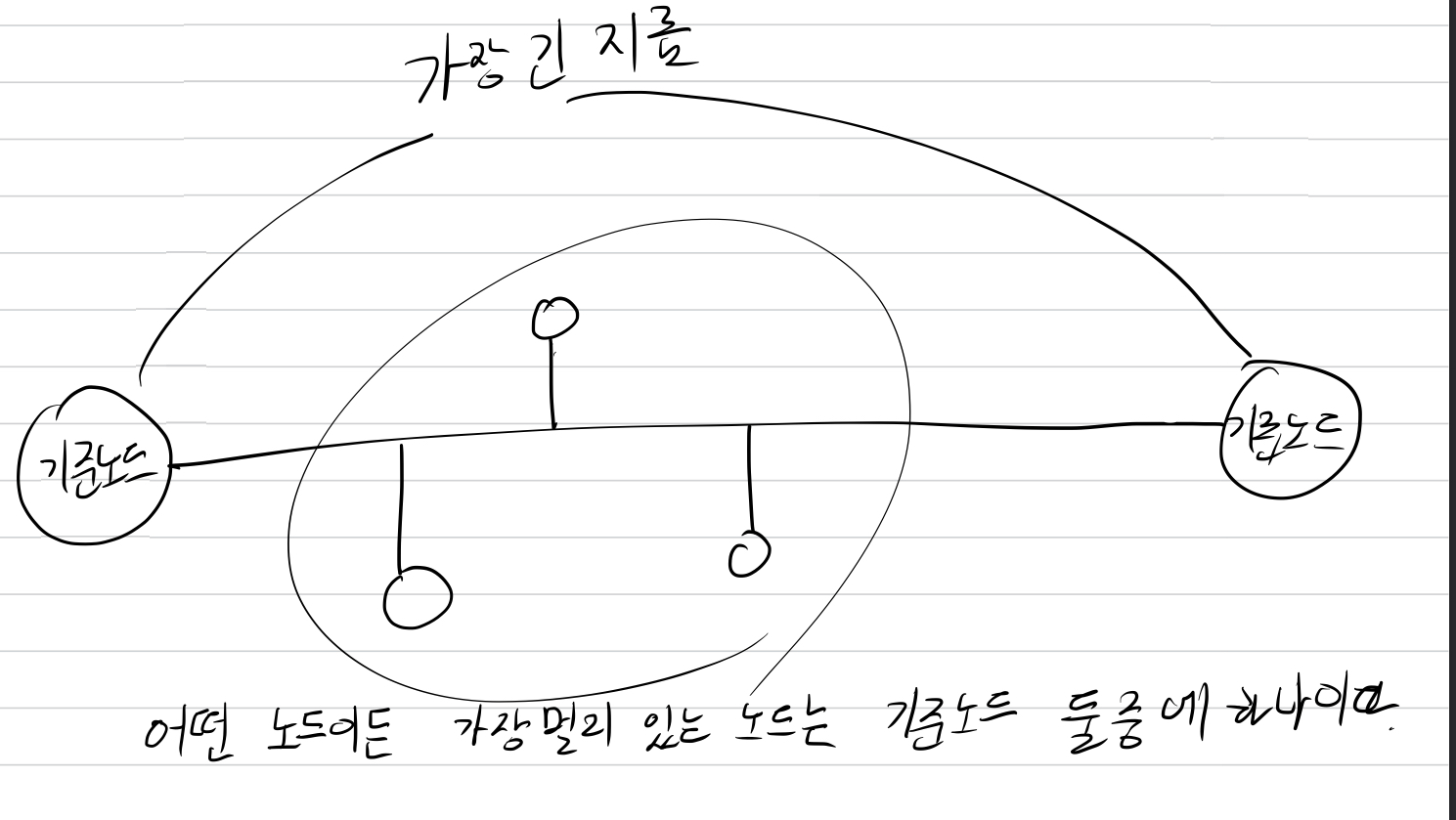 2번째 방법: 검색을 통해 얻은 힌트는 바로 어떤 두 노드를 댕겨 늘여뜨렸을 때 어떤 임의의 노드에서 가장 거리가 먼 노드는 결국 가장 긴지름을 가지는 기준 노드가 된다.