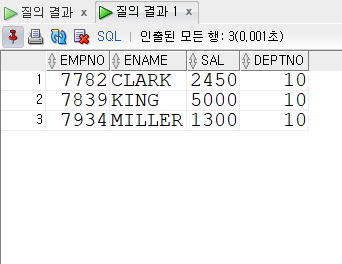 WHERE DEPTNO = 10; --DEPTNO가 10인 행만 출력하기