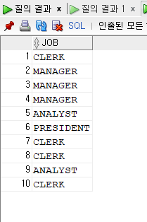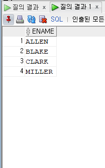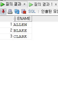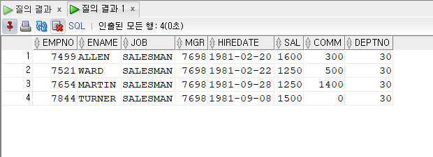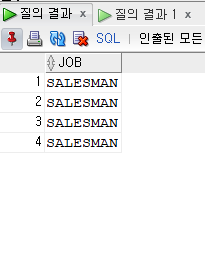 출력결과를 보면 JOB = 'SALESMAN'이 FALSE인 경우를 출력해 != 'SALESMAN' 의 조건과 같은 효과를 낸다.